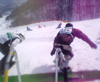 と、しばらくしてじっとしていられなくなったMasaはフラっと表へ。とそこに、朝会ったPさんの友達、Aさんみ~っけ。アルペンボーダーのAさんに誘われ、初ゲート練習へ♪1本エッジに乗ってスピードにノルあの感覚、癖になりました。Aさん楽しい時間をアリガトウ!